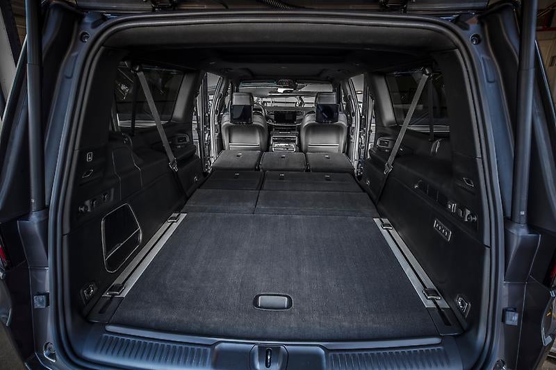 Every Wagoneer has 27.4 cubic feet of luggage space with all seats in place. You can compare that to the more typical 18 or 22 cubic feet in other 3 row SUVs. If you need more space for gear, the Carbide Package adds adjustable roof-rail crossbars. It also comes with a special reversible mat and a cargo cover.